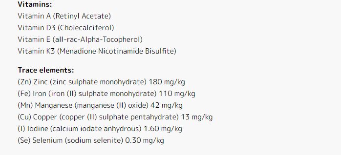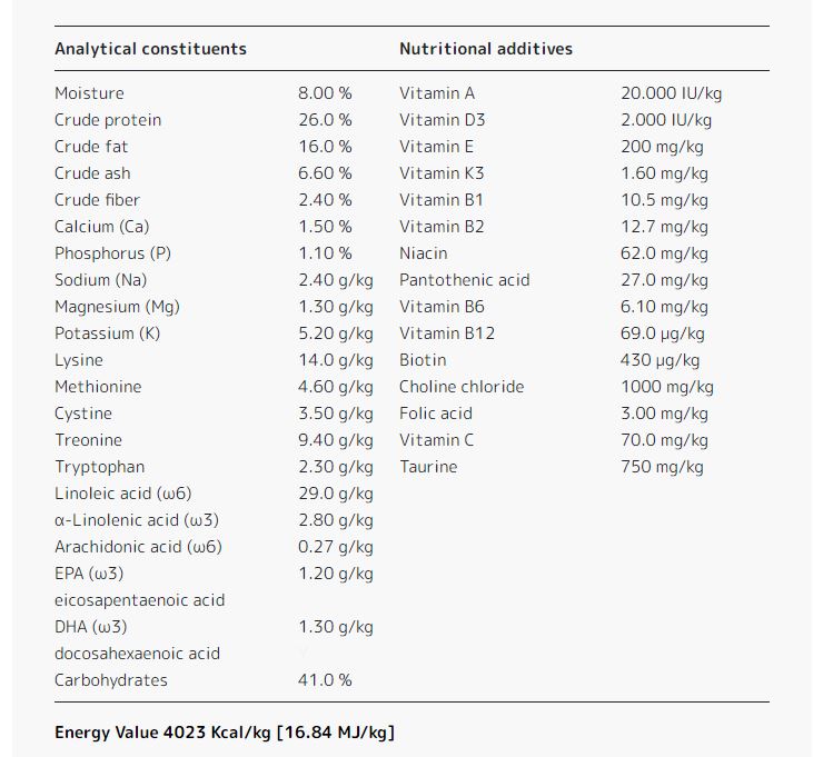 Carne de pasăre deshidratată, porumb tânăr, orez, orz perlat, tărâțe de orez, grăsime de pasăre (conservată cu tocoferoli mixți, sursă naturală de vitamina E), pulpă de sfeclă deshidratată (bogată în pectine), proteină hidrolizată de pui, ulei de somon pur premium, drojdie (o sursă naturală de mananoligozaharide (prebiotic MOS), pește deshidratat, pudră de ouă întregi, minerale, gelatină (proteină de colagen hidrolizată, o sursă naturală de aminoacizi esențiali), inulină (extrasă din rădăcină de cicoare, o sursă nutritivă de fructooligozaharide (prebiotic FOS)), extract de crustacee și moluște (o sursă nutritivă de glucozamină), sulfat de condroitină.