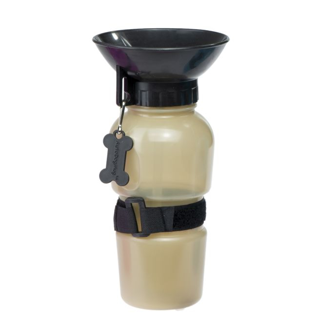 Sticla este echipată cu un capac special sub formă de castron, care se umple cu apă în timp ce apasă sticla!